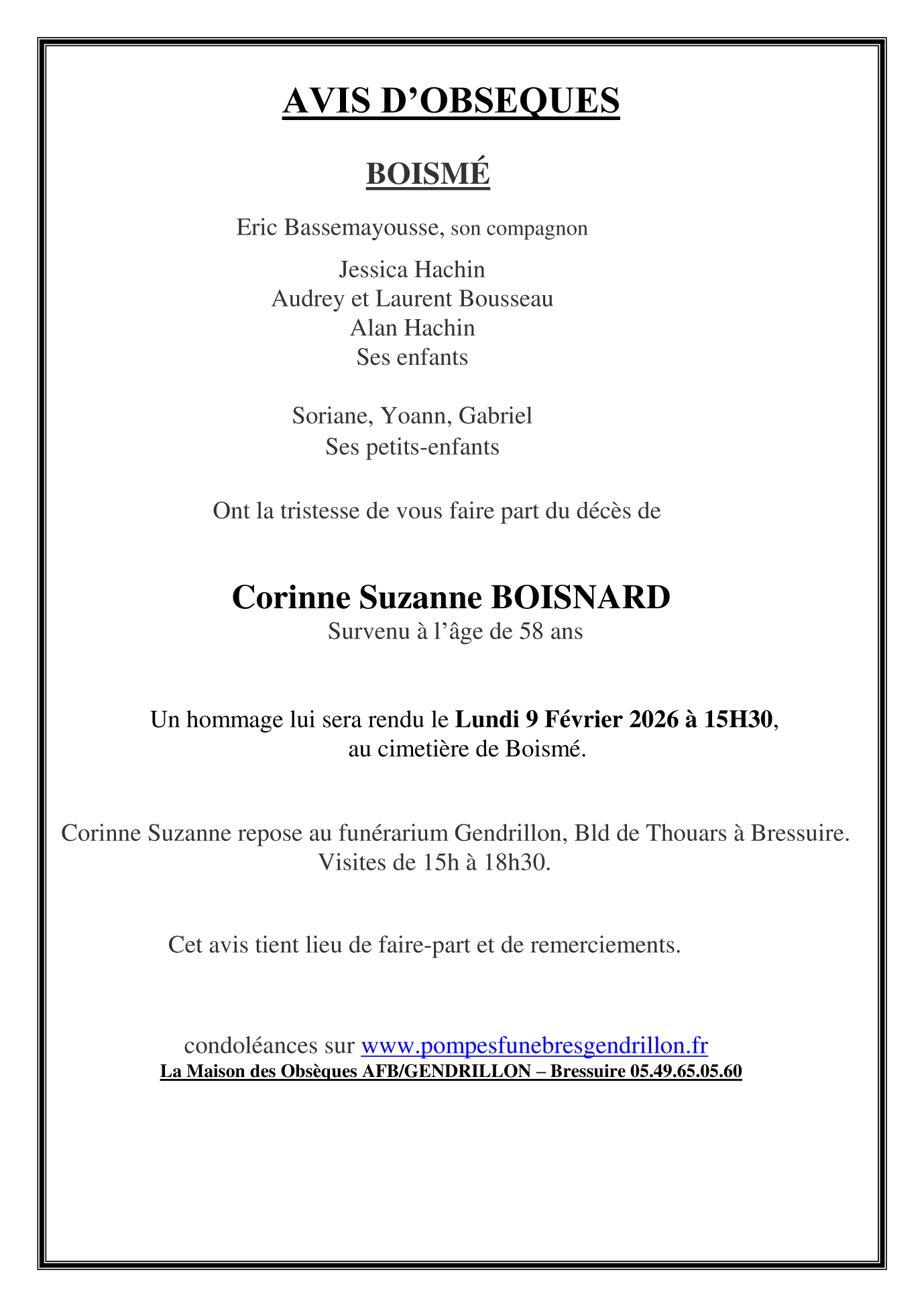 Cet espace « condoléances » est dédié à la mémoire de Madame Corinne BOISNARD.