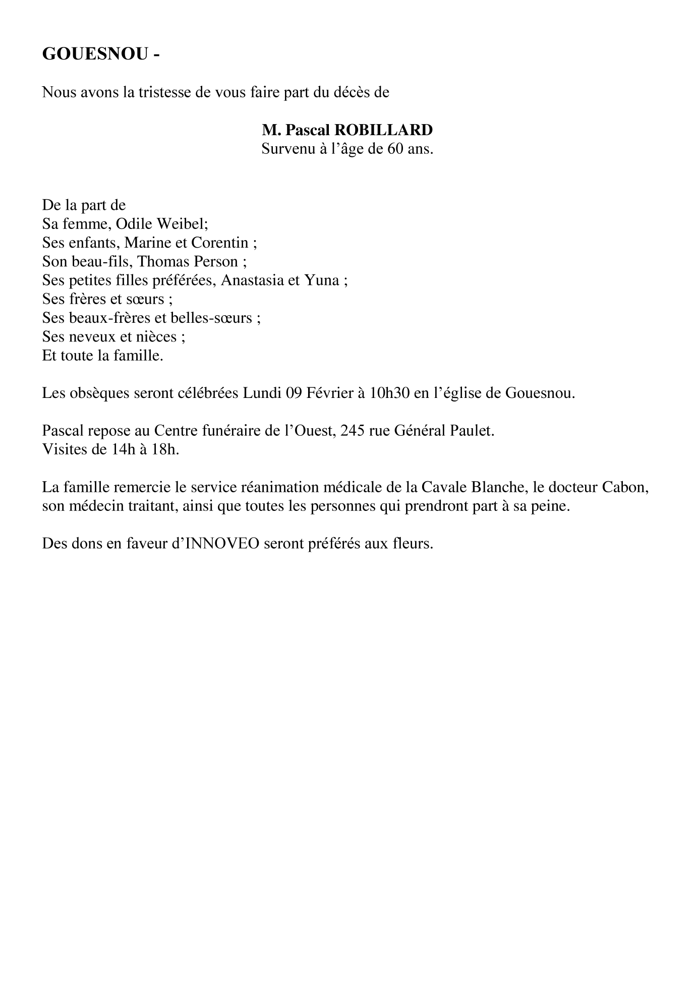 Cet espace « condoléances » est dédié à la mémoire de Monsieur Pascal ROBILLARD.