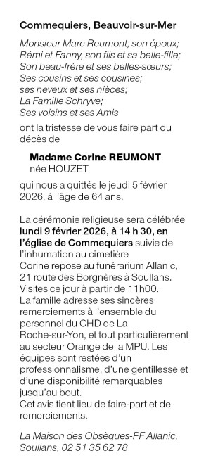 Cet espace « condoléances » est dédié à la mémoire de Madame Corine REUMONT née HOUZET.