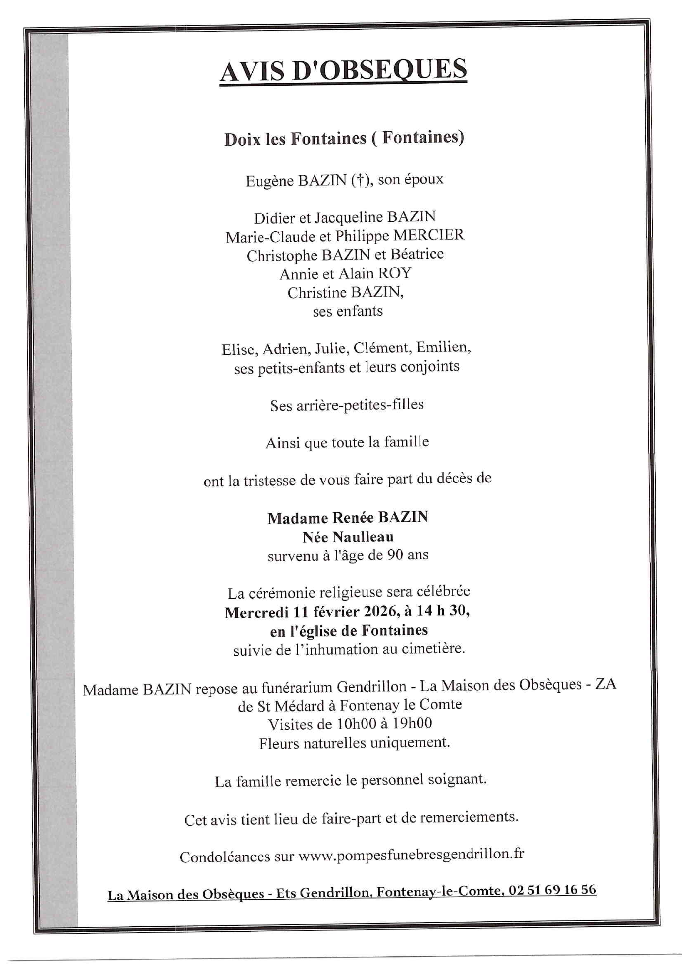 de Madame Renée BAZIN née NAULLEAU