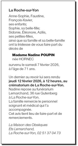 Cet espace « condoléances » est dédié à la mémoire de Madame Nadine POUPIN née HORNEC.