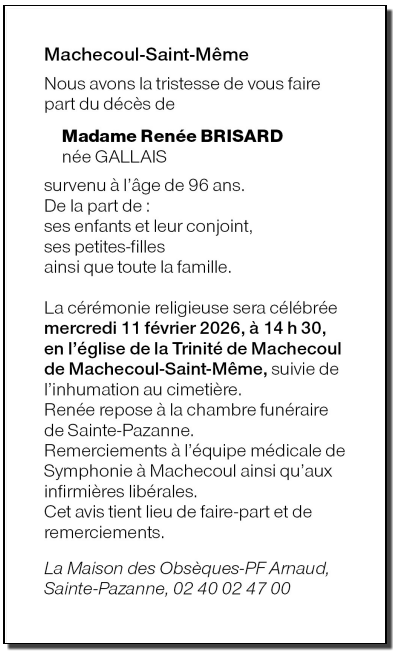Cet espace « condoléances » est dédié à la mémoire de Madame Renée BRISARD née GALLAIS.