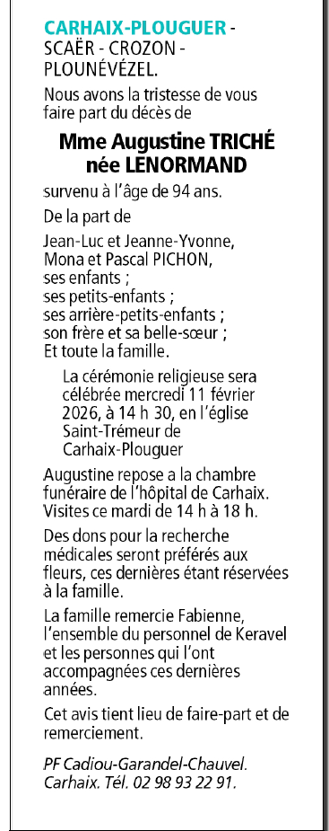 Décédée à Carhaix-Plouguer (29270) le lundi 9 février 2026