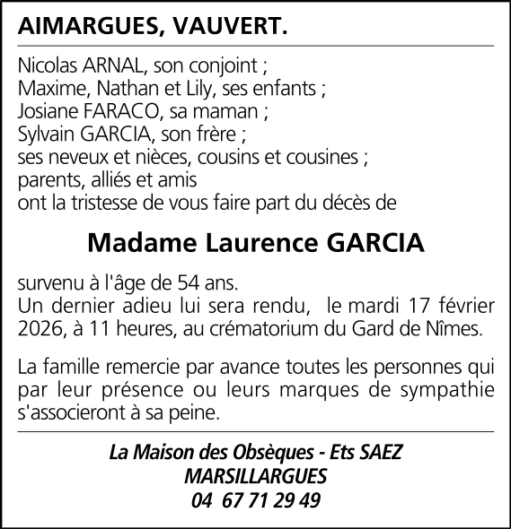 Cet espace « condoléances » est dédié à la mémoire de Madame Laurence GARCIA.