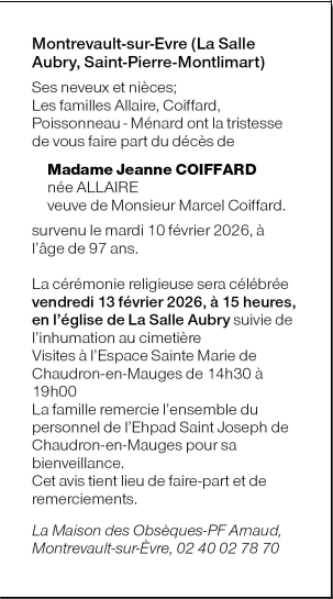 Cet espace « condoléances » est dédié à la mémoire de Madame Jeanne COIFFARD née ALLAIRE.