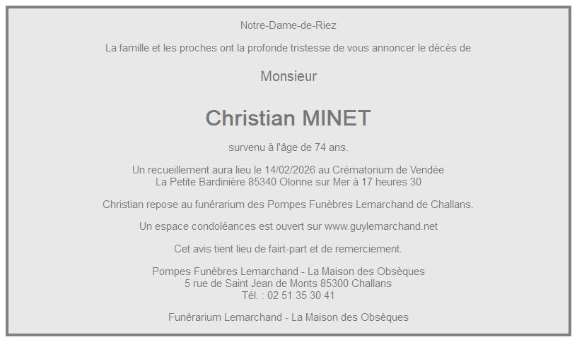 Cet espace « condoléances » est dédié à la mémoire de Monsieur Christian MINET.