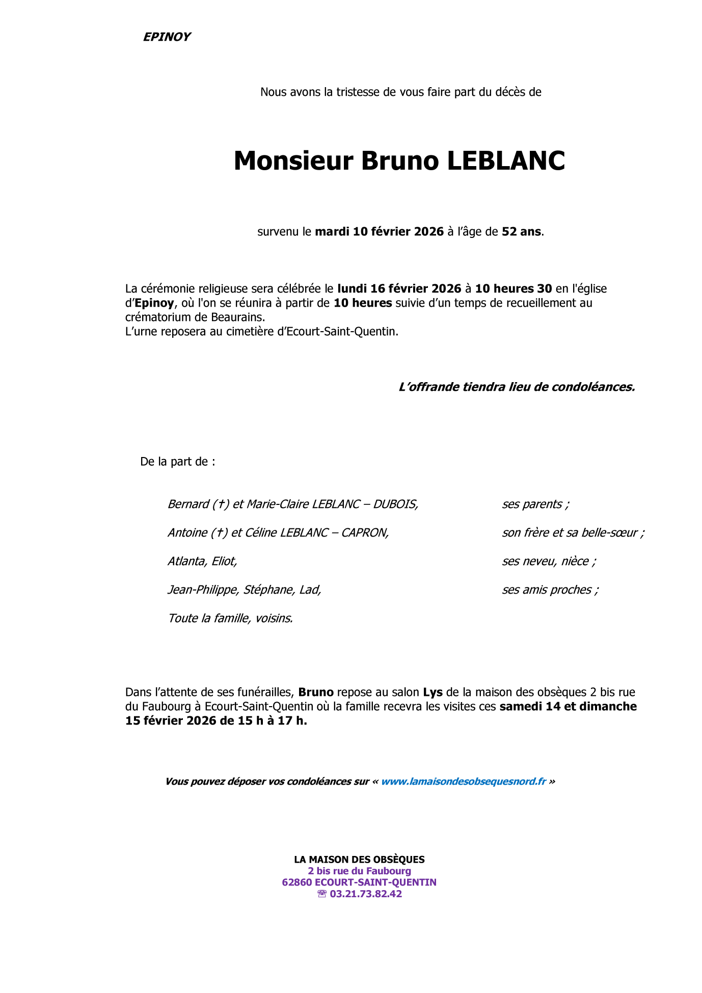 Cet espace « condoléances » est dédié à la mémoire de Monsieur Bruno LEBLANC.