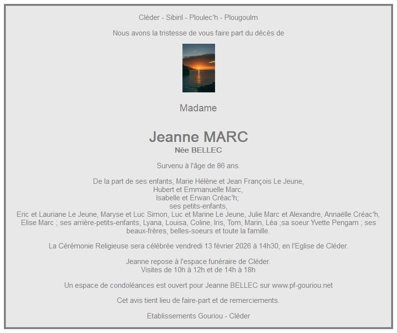 Cet espace « condoléances » est dédié à la mémoire de Madame Jeanne MARC née BELLEC.