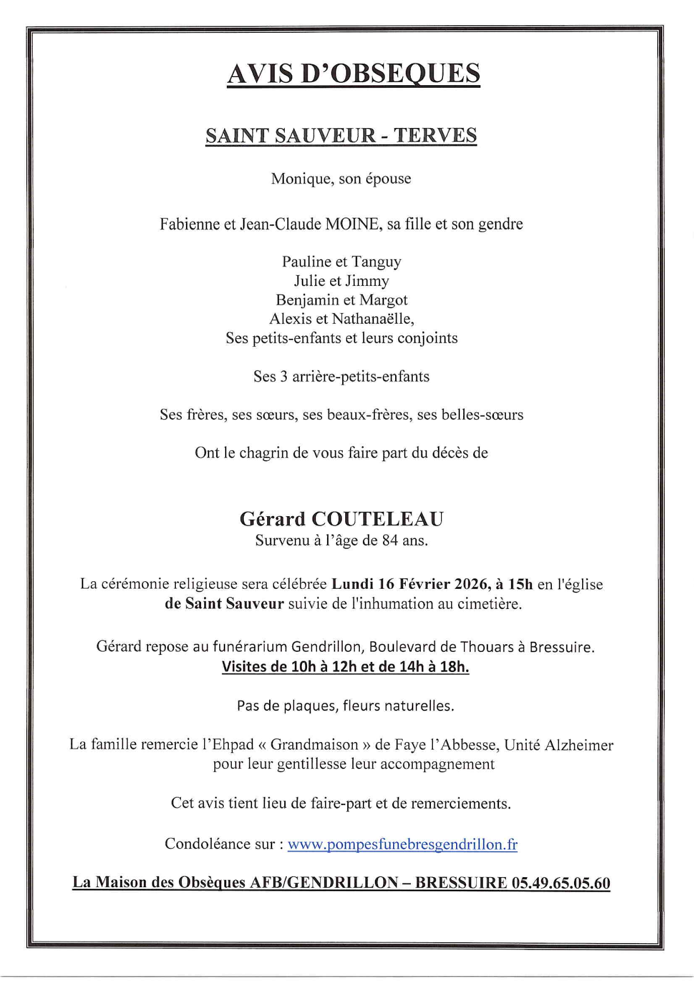 Cet espace « condoléances » est dédié à la mémoire de Monsieur Gérard COUTELEAU.