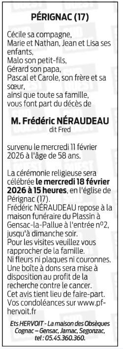 Cet espace « condoléances » est dédié à la mémoire de Monsieur Frédéric NÉRAUDEAU.