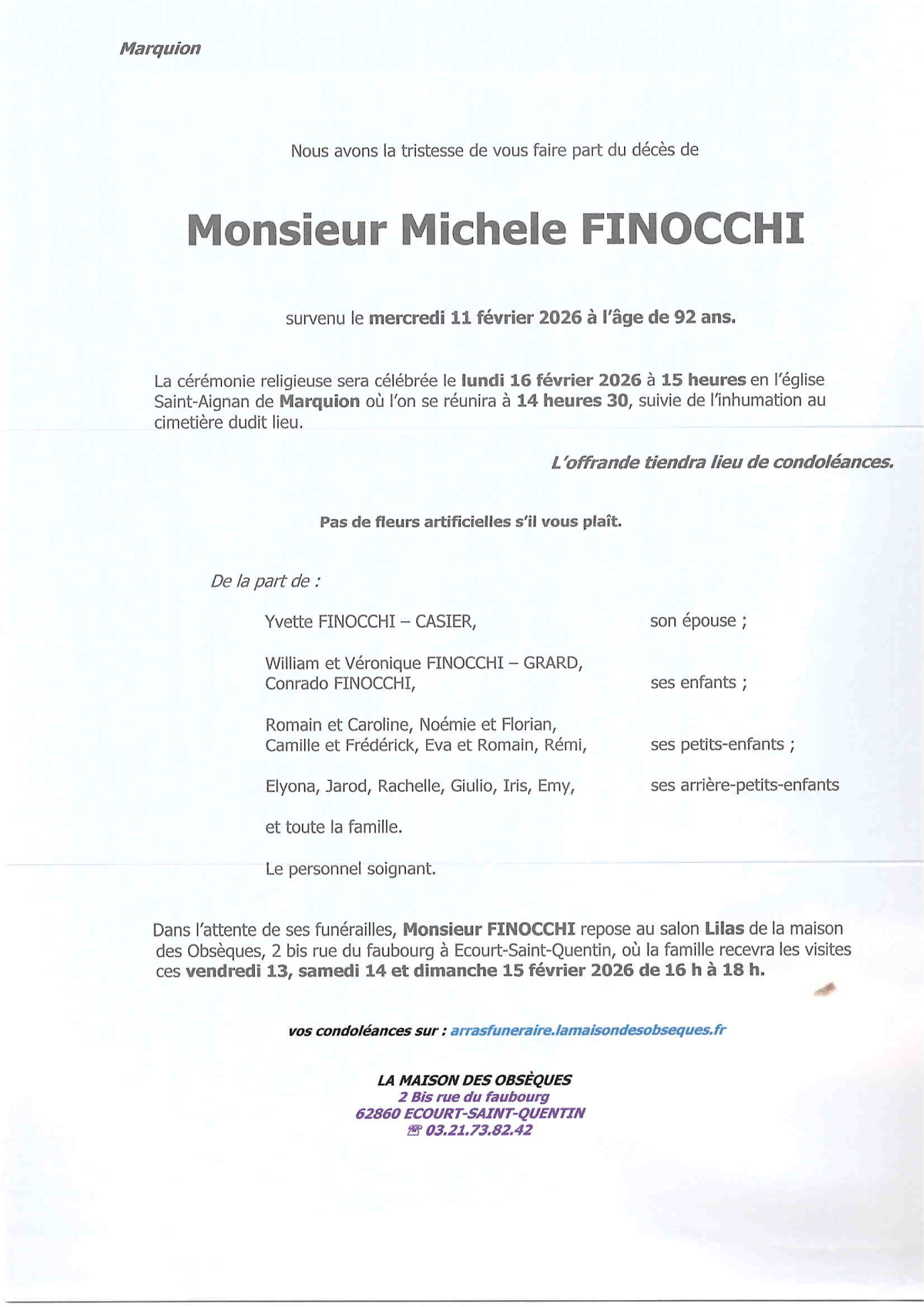 Décédé à Marquion (62860) le mercredi 11 février 2026