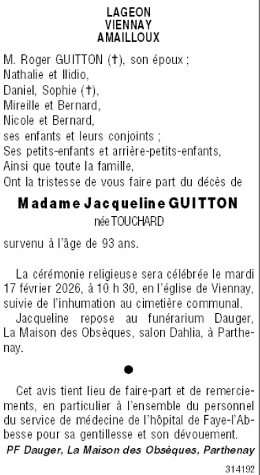 Cet espace « condoléances » est dédié à la mémoire de Madame Jacqueline GUITTON née TOUCHARD.