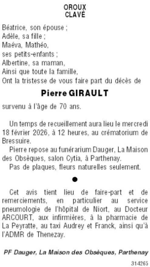 Décédé à Oroux (79390) le jeudi 12 février 2026