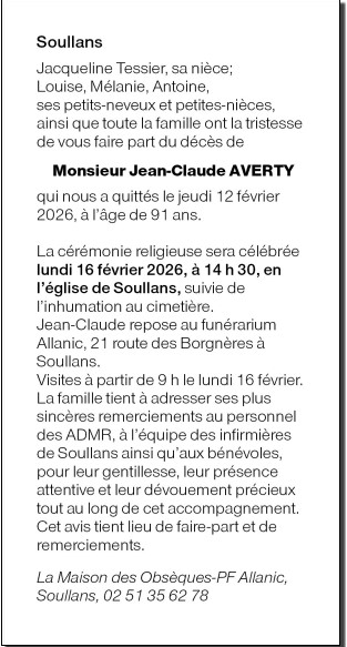 Décédé à Soullans (85300) le jeudi 12 février 2026