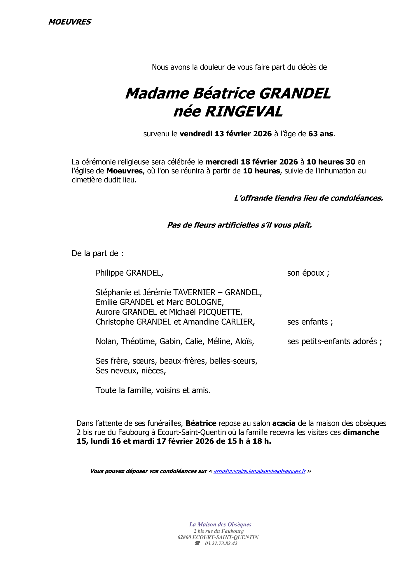 Cet espace « condoléances » est dédié à la mémoire de Madame Béatrice GRANDEL née RINGEVAL.