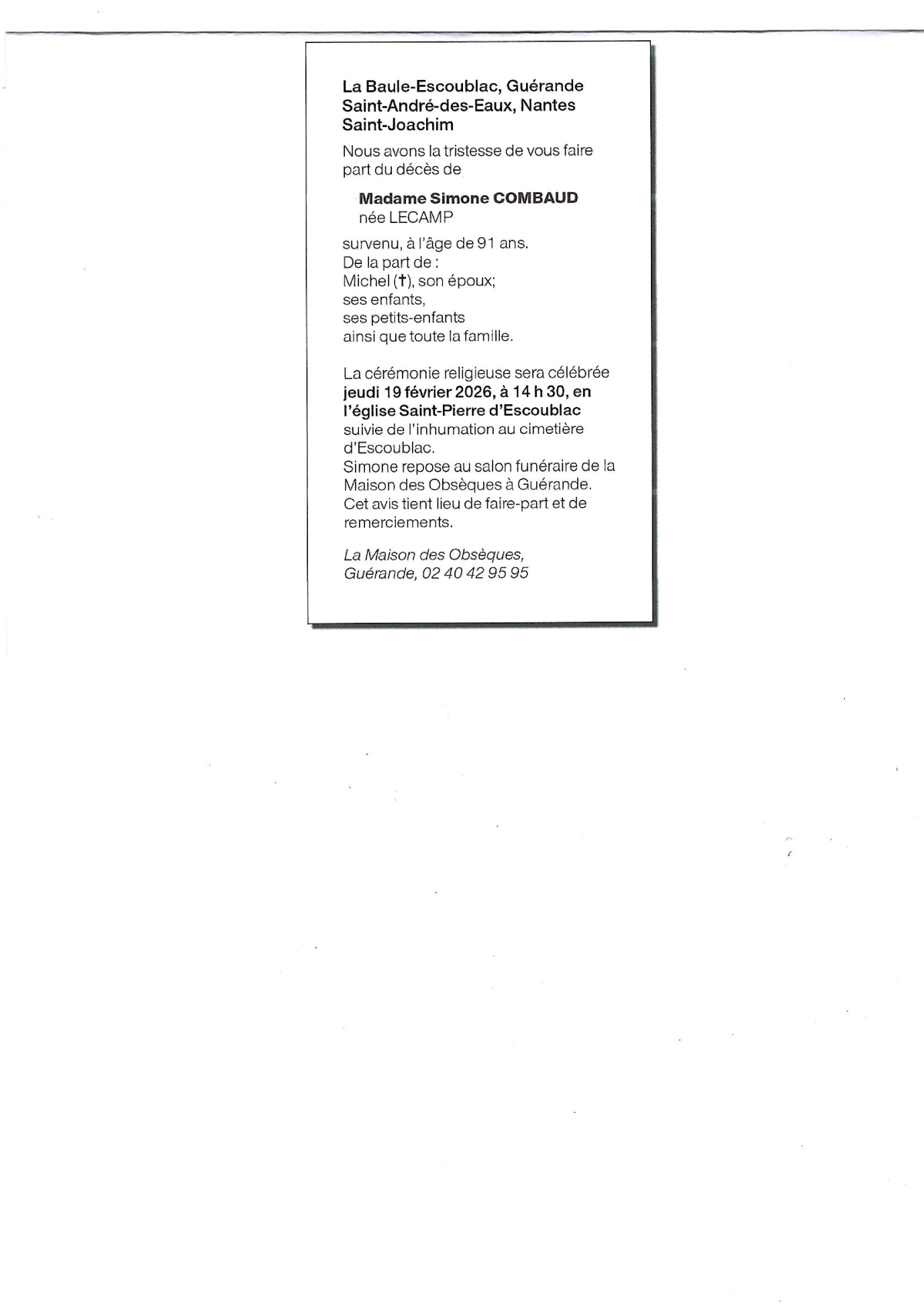 Cet espace « condoléances » est dédié à la mémoire de Madame Simone COMBAUD née LECAMP.