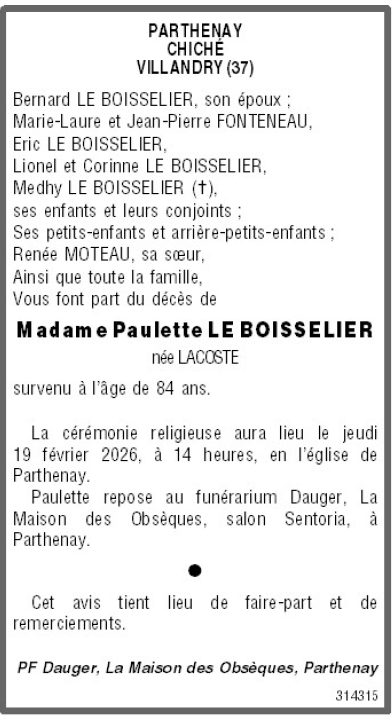 de Madame Paulette LE BOISSELIER née LACOSTE
