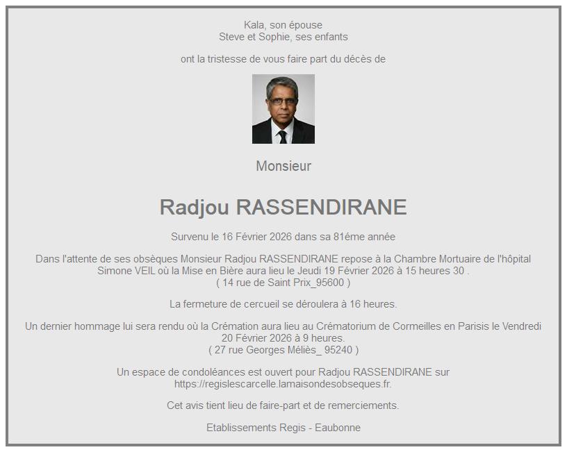 Cet espace « condoléances » est dédié à la mémoire de Monsieur Radjou RASSENDIRANE.