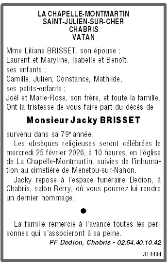 Cet espace « condoléances » est dédié à la mémoire de Monsieur Jacki BRISSET.