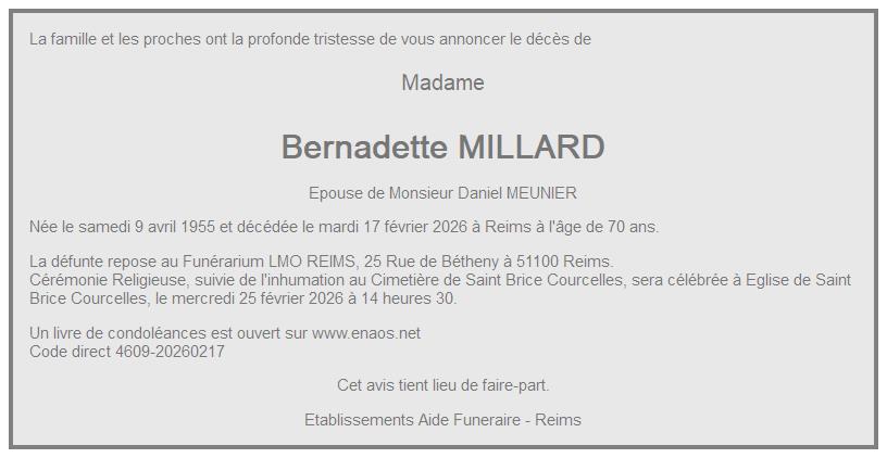 Cet espace « condoléances » est dédié à la mémoire de Madame Bernadette MEUNIER née MILLARD.