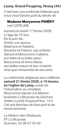 Cet espace « condoléances » est dédié à la mémoire de Madame Maryvonne PIHÉRY née CATELINE.