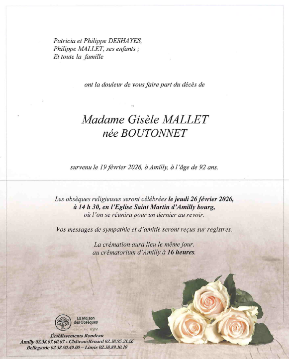 Cet espace « condoléances » est dédié à la mémoire de Madame Gisèle MALLET née BOUTONNET.