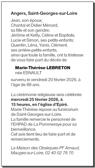 Cet espace « condoléances » est dédié à la mémoire de Madame Marie-Thérèse LEBRETON née ESNAULT.