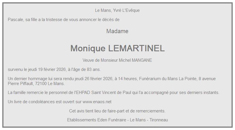 de Madame Monique MANGANE née LEMARTINEL