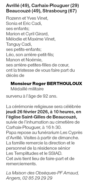 Cet espace « condoléances » est dédié à la mémoire de Monsieur Roger BERTHOULOUX.