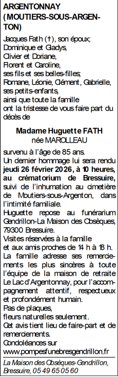 Cet espace « condoléances » est dédié à la mémoire de Madame Huguette FATH née MAROLLEAU.