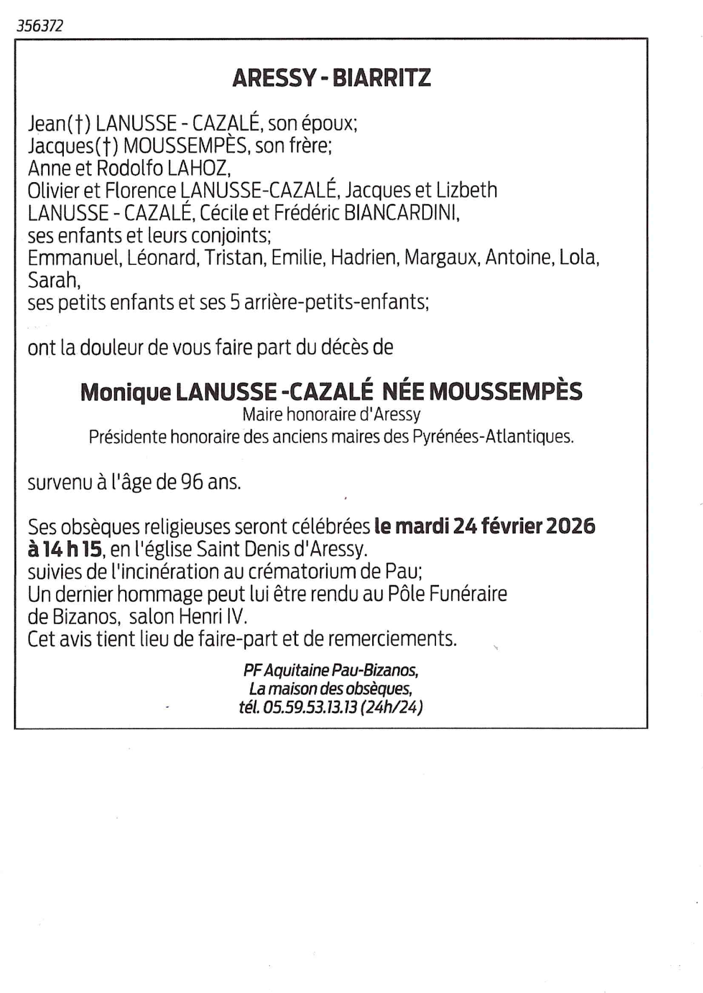 de Madame Monique LANUSSE-CAZALÉ née MOUSSENPÈS