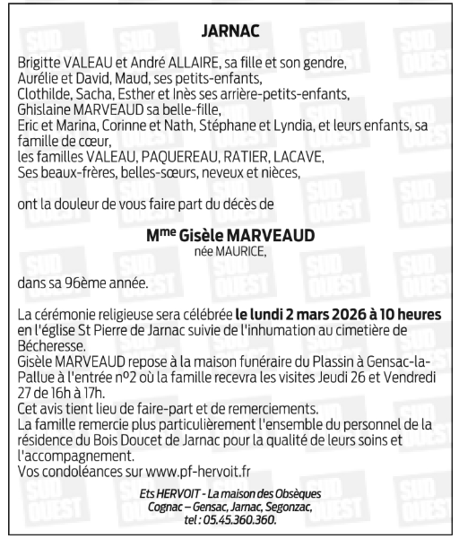 Cet espace « condoléances » est dédié à la mémoire de Madame Gisèle MARVEAUD née MAURICE.