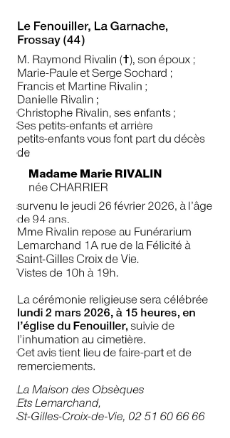 Cet espace « condoléances » est dédié à la mémoire de Madame Marie RIVALIN née CHARRIER.