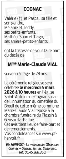Cet espace « condoléances » est dédié à la mémoire de Madame Marie - Claude VIAL.