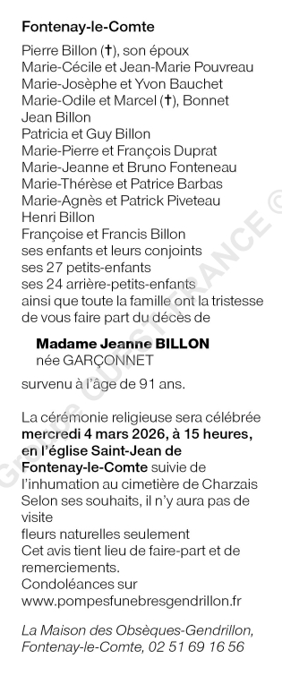 Cet espace « condoléances » est dédié à la mémoire de Madame Jeanne BILLON née GARCONNET.