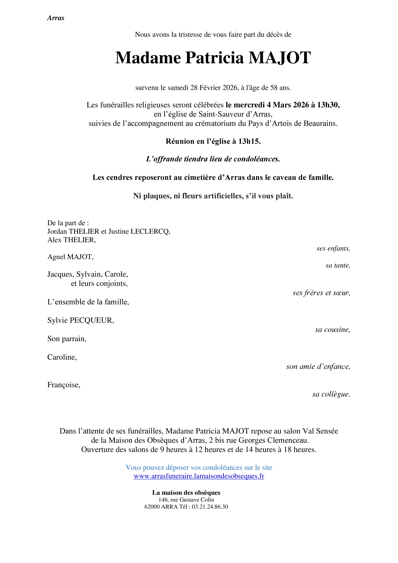 Cet espace « condoléances » est dédié à la mémoire de Madame Patricia MAJOT.