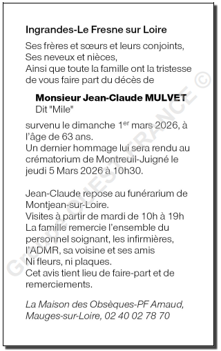 Cet espace « condoléances » est dédié à la mémoire de Monsieur Jean-Claude MULVET.