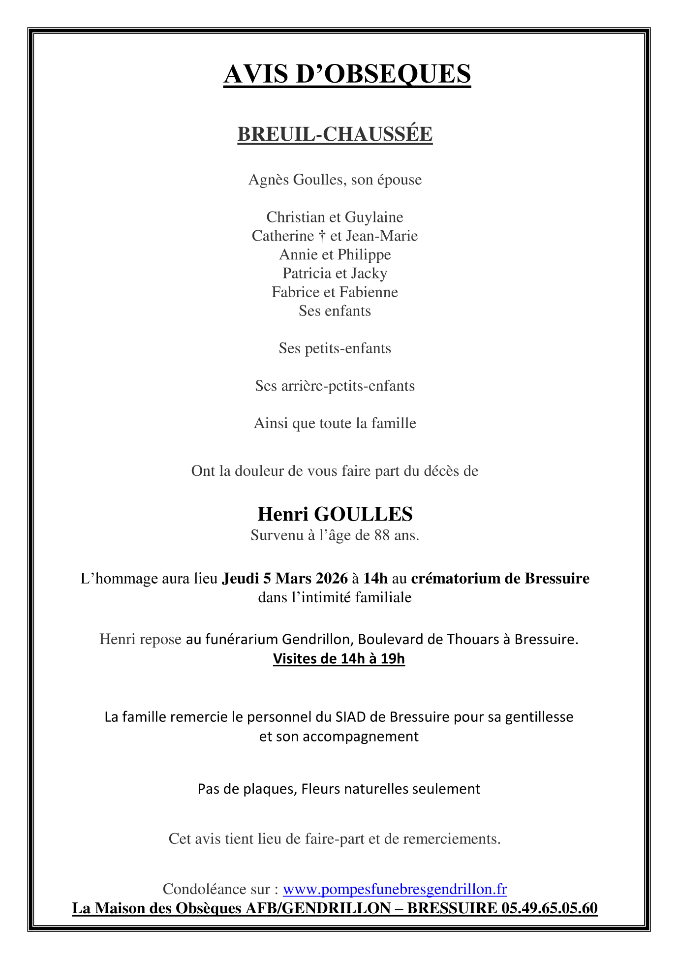 Cet espace « condoléances » est dédié à la mémoire de Monsieur Henri GOULLES.