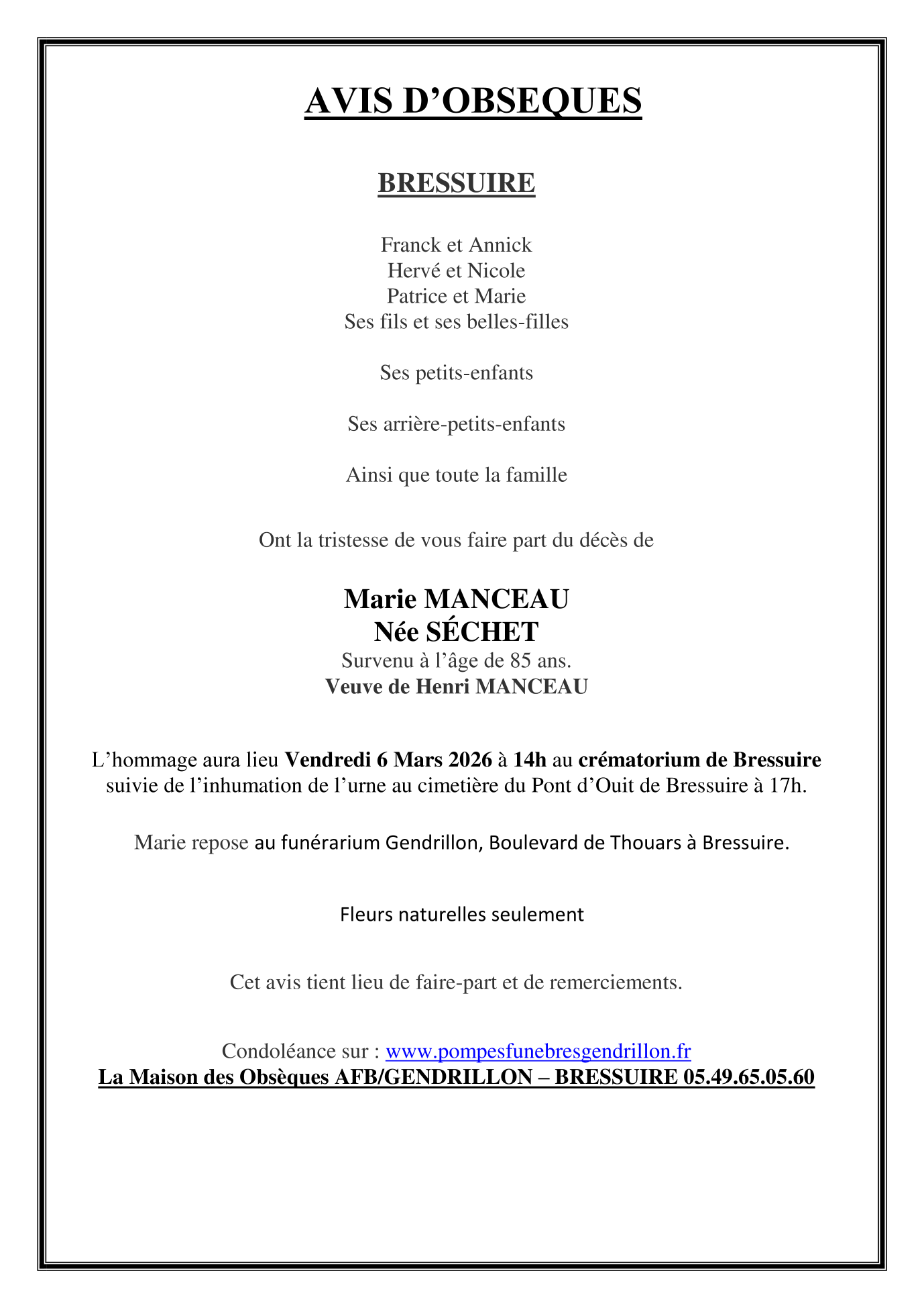Cet espace « condoléances » est dédié à la mémoire de Madame Marie Manceau née SECHET.