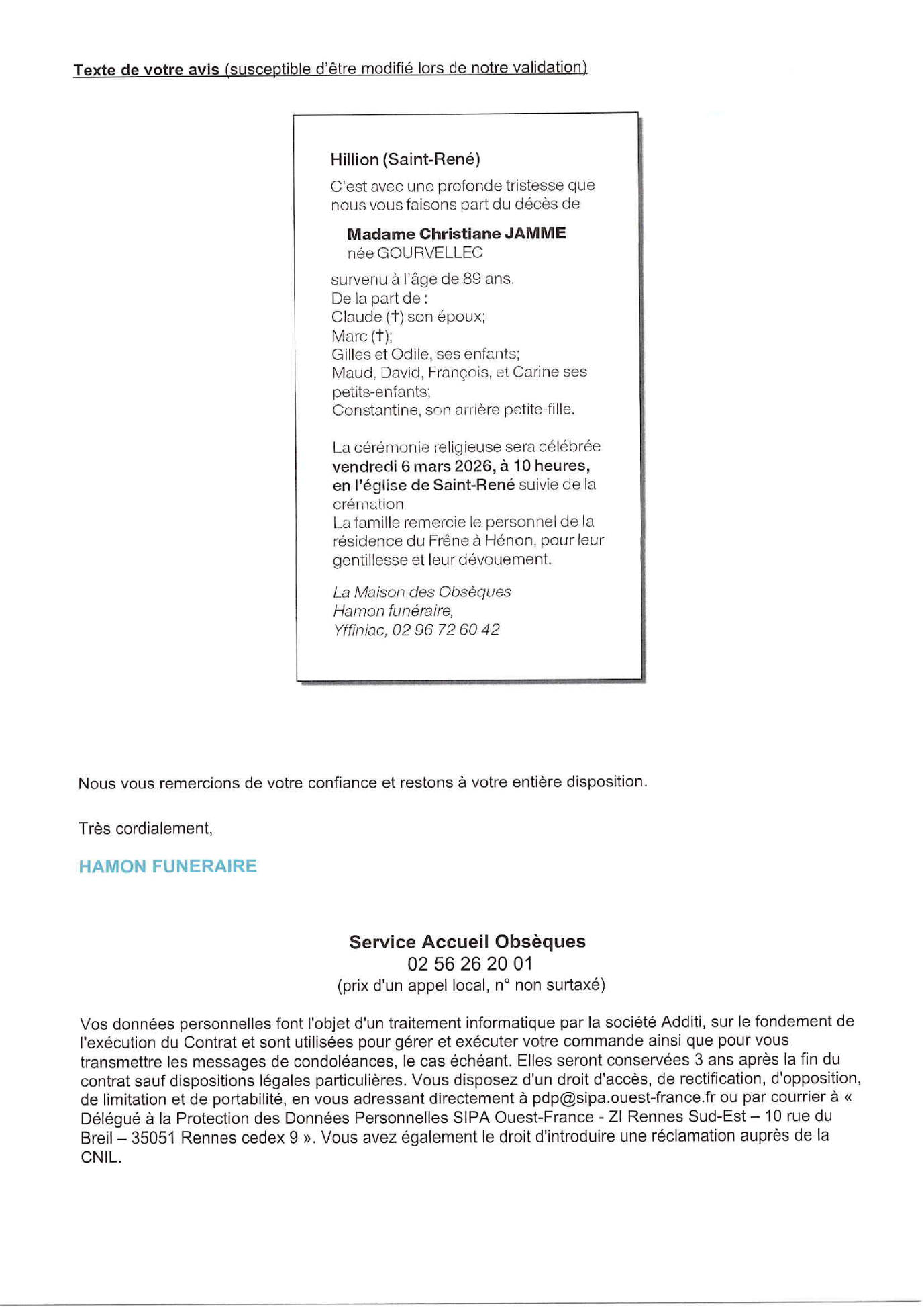 Cet espace « condoléances » est dédié à la mémoire de Madame Christiane JAMME née GOURVELLEC.
