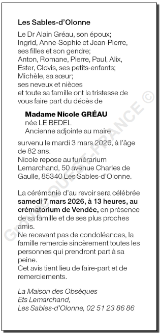 Cet espace « condoléances » est dédié à la mémoire de Madame Nicole GRÉAU née LE BEDEL.