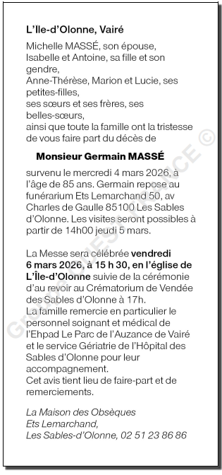 Cet espace « condoléances » est dédié à la mémoire de Monsieur Germain MASSÉ.
