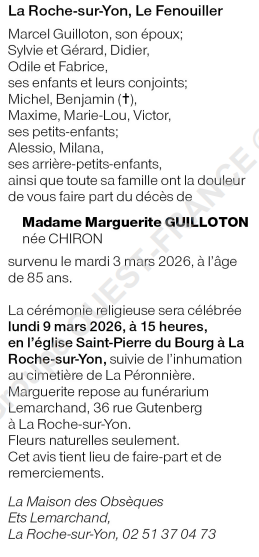 Cet espace « condoléances » est dédié à la mémoire de Madame Marguerite GUILLOTON née CHIRON.