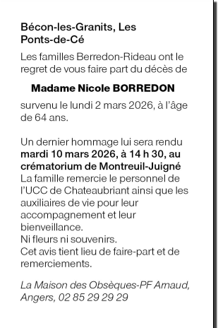 Cet espace « condoléances » est dédié à la mémoire de Madame Nicole BORREDON.