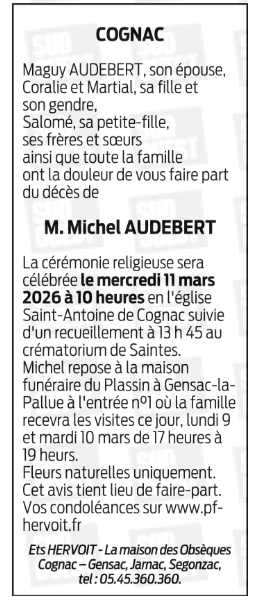 Cet espace « condoléances » est dédié à la mémoire de Monsieur Michel AUDEBERT.
