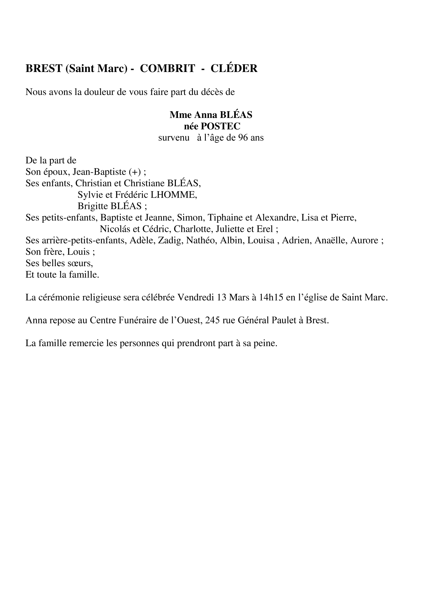 de Madame Anna BLEAS née POSTEC