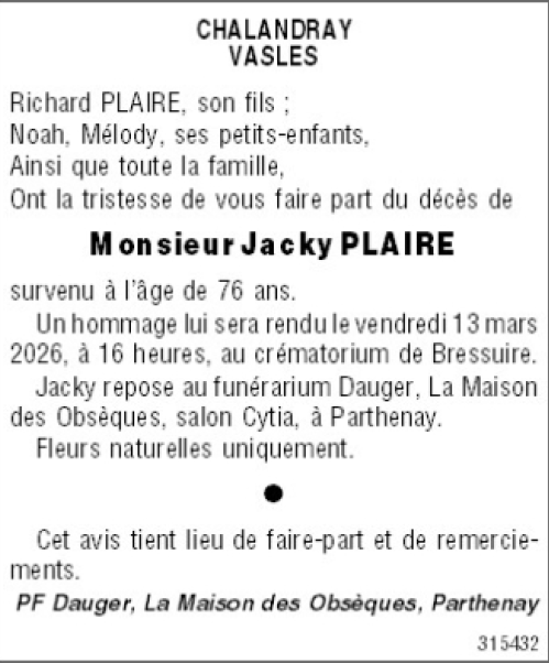 Cet espace « condoléances » est dédié à la mémoire de Monsieur Jacky PLAIRE.