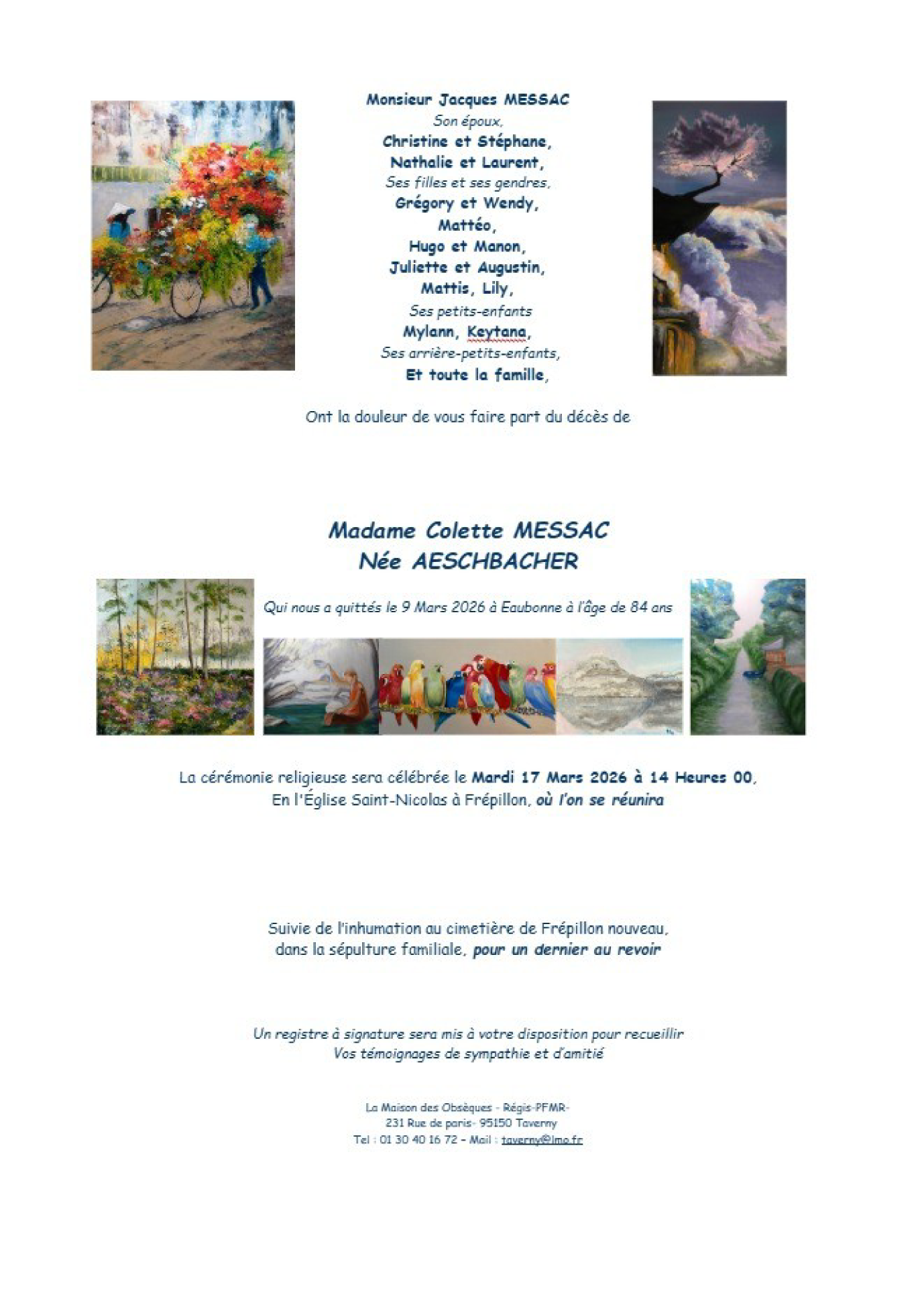 Cet espace « condoléances » est dédié à la mémoire de Madame Colette MESSAC née AESCHBACHER.