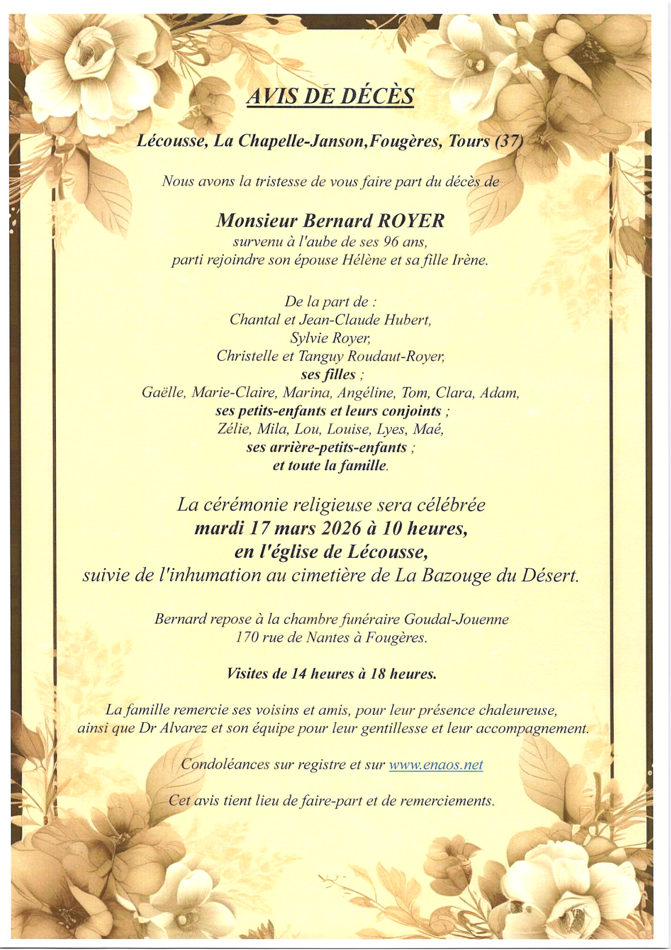 Cet espace « condoléances » est dédié à la mémoire de Monsieur Bernard ROYER.