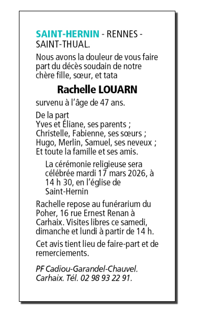Cet espace « condoléances » est dédié à la mémoire de Madame Rachelle LOUARN.